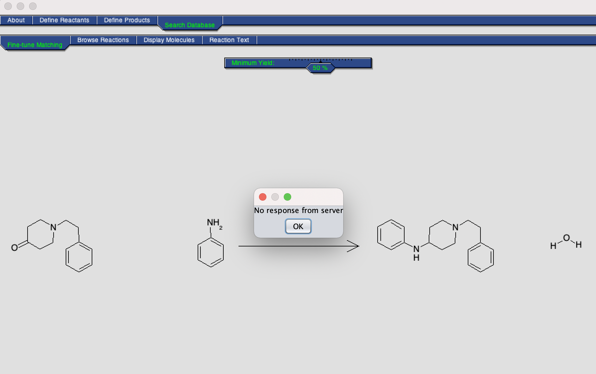 Great site and good job! I'd found it a year or so back and used it successfully to do some reaction searching. I've come back again recently (with updated java, version # 8, build 161) but trying to do some reaction searching gives me an error from the java applet "No response from server", and was wondering if I could get some advice, please?