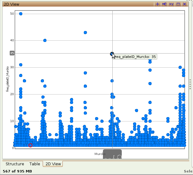 Thank you for your quick response. My original goal of plotting the frequencies of a structure in a bar graph for a large dataset, is not efficient at all. Upon searching the DataWarrior forum (which is what I should have done initially), I learned that I should first calculate the frequency with the function frequencyInCategory("PlateID","Murcko"), and then display the results in a scatter plot. I was able to display the frequency of interest for over 3000 Murcko structures AND still get a readable information, as in attached. Thank you to you and fellow warriors.
