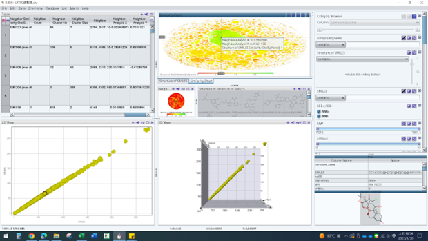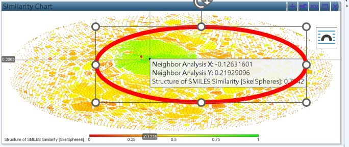 In the simiarity chart, choose reference structure, then I can get the "Neighbor Analysis X&Y" and "Structure of smile similarity" of this structure. After that, move the mouse to another structure (no click), can get "Structure of smile similarity" based on reference structure.(Figure 1&2).