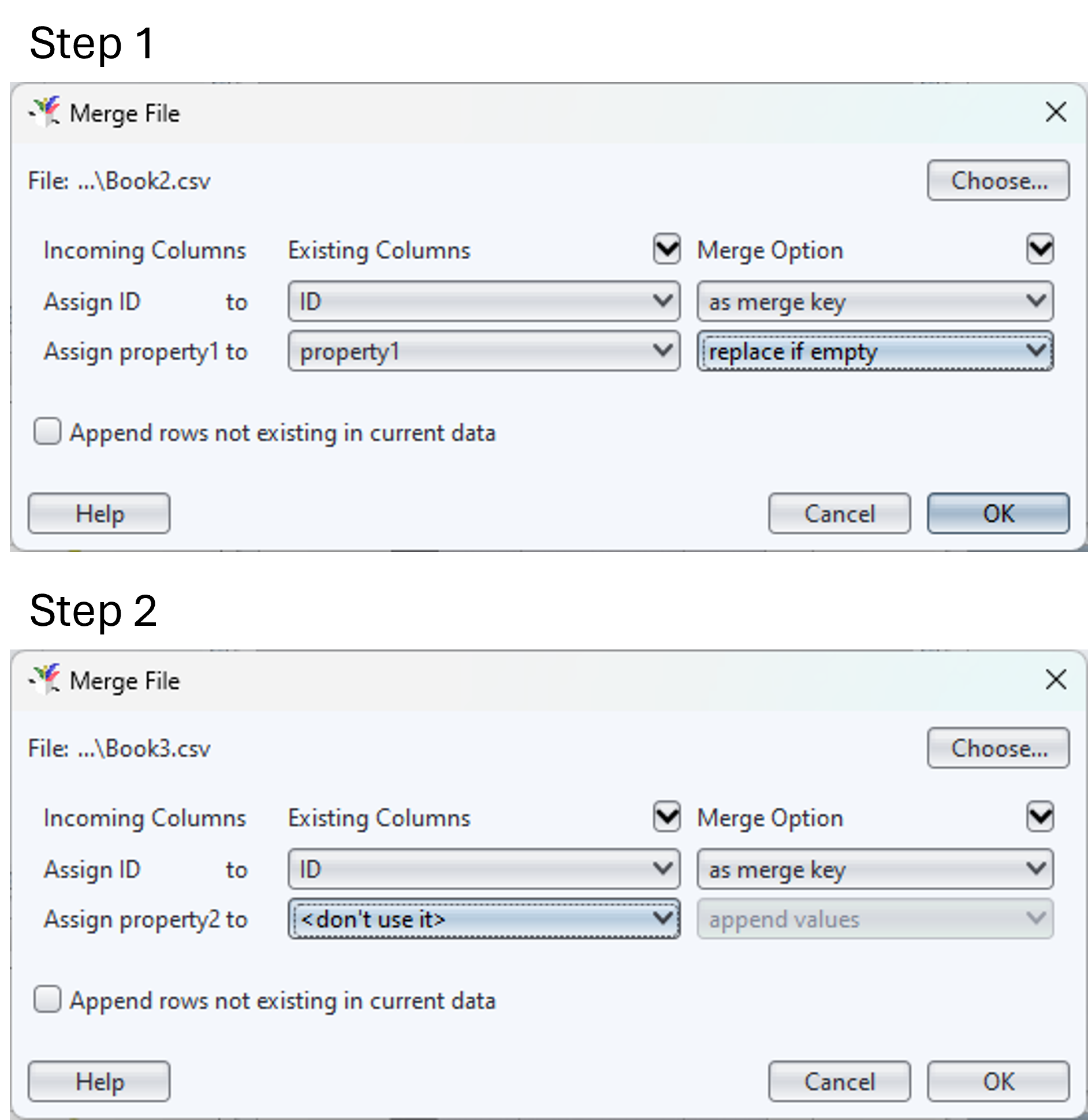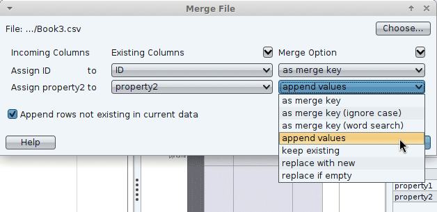 I merged Book2.csv at step 1, then I try to merge Book3.csv, and the "Merge File" panel can not recognize "property2" automatically.