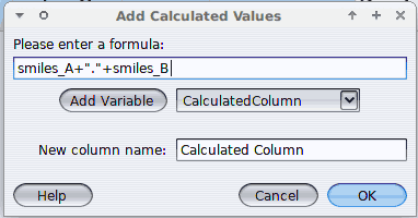 If so, 1) convert the structures you already have in the .dwar file as SMILES. You find this function along chemistry -> from chemical structure -> Add SMILES code, to be applied for each column of structures. 2) To concatenate the SMILES, reach for Data -> Add Calculate Values. In the new sub-menu, you define a string addition, of the SMILES, as shown below:
