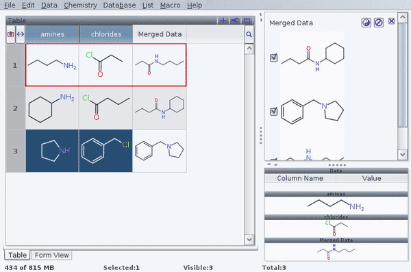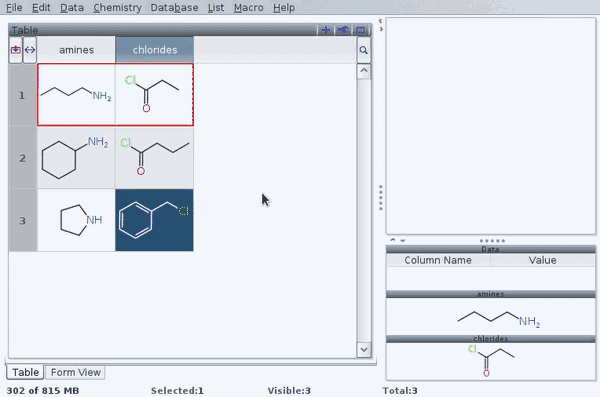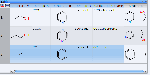 After confirmation by «ok», DataWarrior creates a new column with the result. You then 3) convert the concatenated SMILES string into a sketch with Chemistry -> Add Structures From Name. This equally creates a niew column, with both molecules represented in one cell: