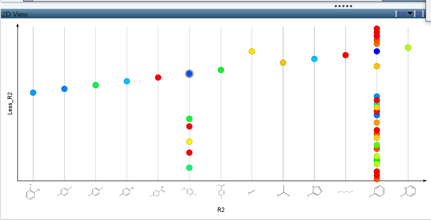 Thanks Thomas, I've looked at my file again in more detail and noticed something odd. If the view is small, I can see the r-grps (attached image rgrp_minimised) but only the vertical lines of the grid (view set to show full grid). If I maximise this window the r-grps disappear and I lose the whole grid (rgrp_maximised). I've included an example dwar file from ChemBL where this behaviour occurs with R5 on the x-axis. Any thoughts how to deal with this?