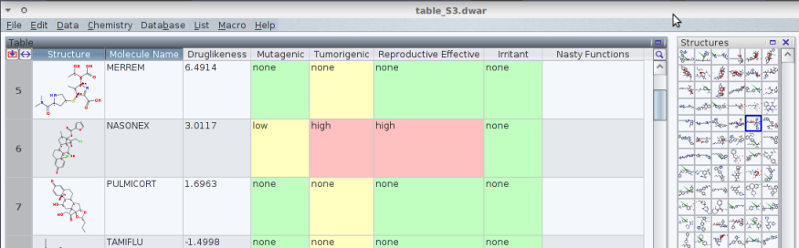 into a .sdf I let DataWarrior screen the structures for a few characteristics.