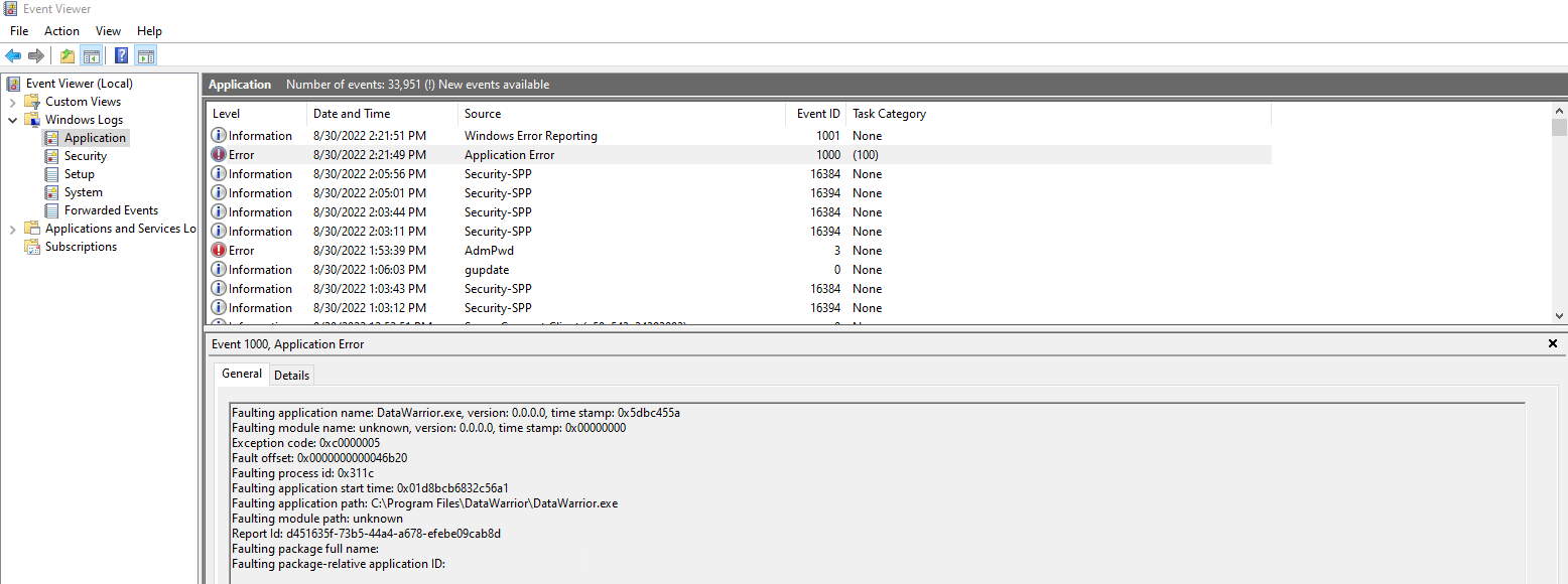 After installing DataWarrior 5.5, the application simply does not run on a Windows 10 system. Some investigation does show that it is erroring out, but the only indication with no detail is in the Windows event logs (the generic BEX64 error).