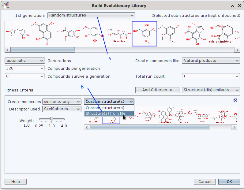 when generating an evolutionary library, DataWarrior offers (at least) twice to use a set of molecules from a .sdf or a .dwar as reference; in the screen photo below, they are marked by (A) and (B).